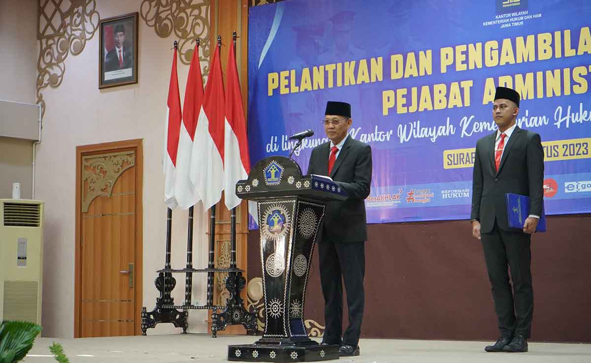 SURABAYA, BANGSAONLINE.com – Kanwil Kemenkumham Jatim melakukan penyegaran pejabat di jajarannya. Total ada 37 pejabat struktural yang dilantik dan diambil sumpahnya pada hari ini, Rabu (23/8/2023).